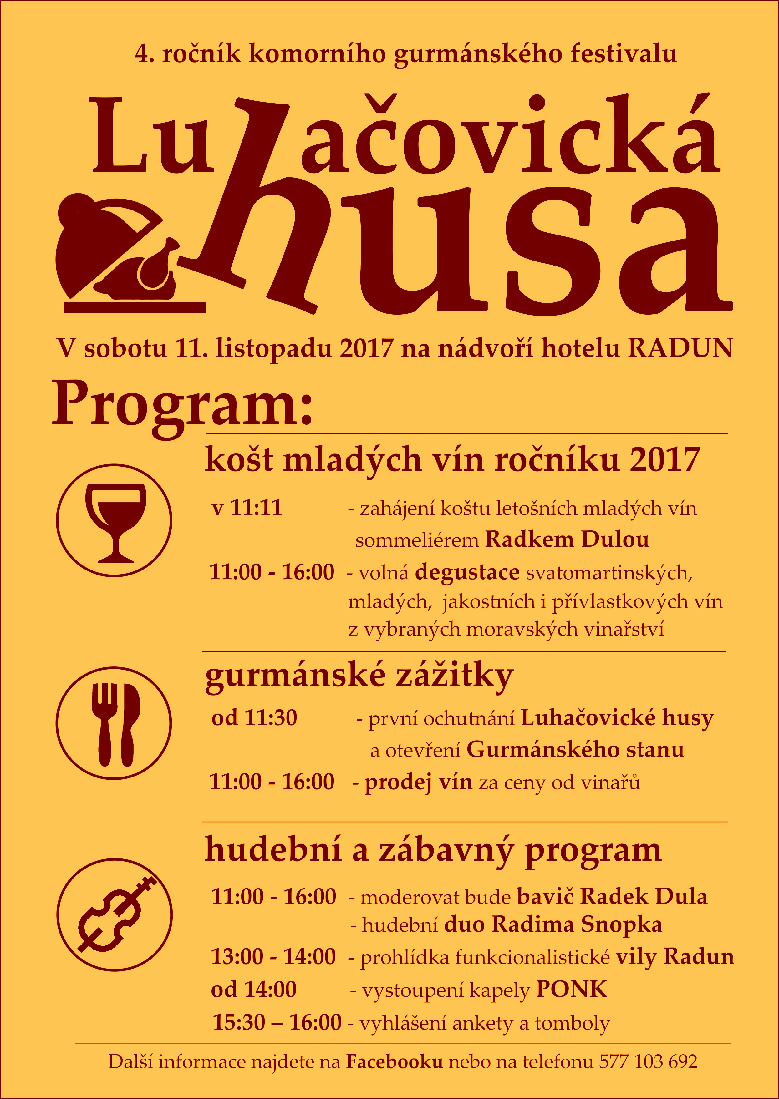 ← Zpět na článkySvatomartinská husa v Luhačovicích8. listopadu 2017Kdybyste náhodou nevěděli, co s volným časem tuto sobotu, stavte se za námi do nádherného funkcionalistického hotelu Radun v Luhačovicích. Na dobré jídlo, dobré víno a dobrou muziku:)